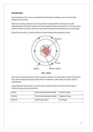 This document discusses the molecular structure of atoms. It begins by explaining that all substances are composed of elements, which are the basic substances, and that elements are made up of very small particles called atoms. It then describes the basic structure of an atom, including that atoms have a small, positively charged nucleus surrounded by negatively charged electrons. The number of protons determines the element and equals the number of electrons. Atoms can gain, lose, or share electrons to attain stable electron configurations, forming ions or molecules.