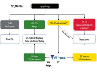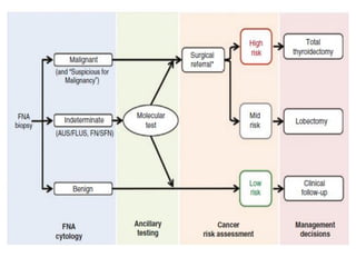 Molecular testing techniques can be used on cytology specimens to facilitate cancer patient management. Fluorescence in situ hybridization (FISH) is well-suited for detecting genomic abnormalities in cytology specimens. FISH involves hybridizing fluorescent probes to target sequences to visualize locations. It can detect gains, losses, amplifications, and rearrangements. A variety of cytology specimens can be used for FISH, including smears, cell blocks, and liquid-based preparations. FISH has applications in detecting abnormalities in cancers like urothelial carcinoma, breast cancer, and lymphoma.