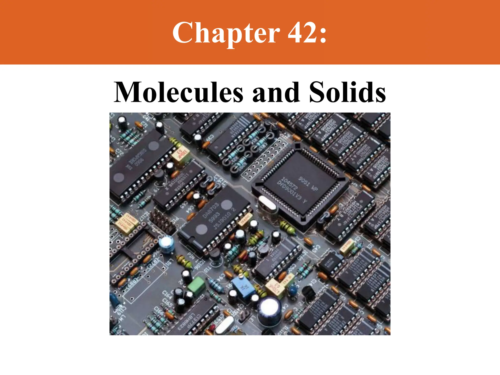 Chapter 42 discusses molecular bonds including ionic, covalent, and hydrogen bonding, with examples of each type provided. The chapter also covers molecular rotational and vibrational motions, including calculations related to energy transitions of molecules, along with quizzes for understanding. Additionally, it addresses the band theory of solids and materials classification, such as conductors, insulators, and semiconductors, with specific examples and calculations.