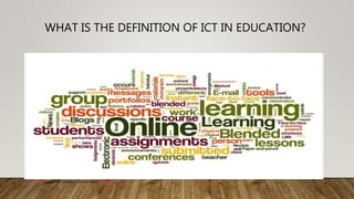 The document defines ICT in education as using technologies like computers and the internet to communicate, create, store, and manage information for educational purposes. It discusses how ICT can be used in education to support student-centered teaching and collaboration. While ICT provides opportunities to develop workforce skills, its disadvantages include high costs, need for trained staff, unreliable equipment, and risk of overdependence.