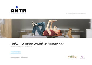 Документ представляет собой гайд по управлению промо-сайтом 'Молина' компании 'Пет-Континент'. В нем описываются различные аспекты администрирования сайта, включая управление пользователями, контентом, каталогом товаров и отзывами. Также содержатся инструкции по редактированию страниц и управлению интерактивными элементами, такими как слайдеры и статьи.