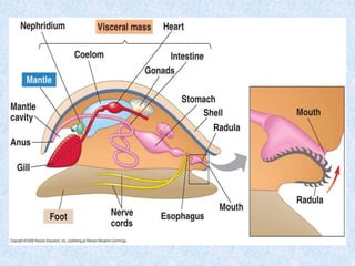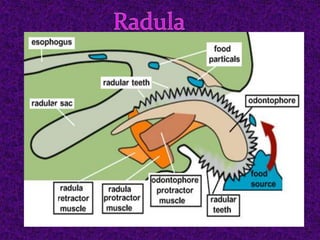 The document provides an introduction and overview of the general characteristics of molluscs. It states that molluscs are soft-bodied animals that inhabit all habitats except air, have existed since the early Cambrian period, and are the second largest phylum of animals. The general characteristics described include having a triploblastic, bilaterally symmetrical body divisible into head, mantle, foot, and visceral mass, with shells sometimes present either internally or externally. Digestion and respiration occur through various organs like the radula, gills, lungs, and the circulatory system utilizes haemocyanin.