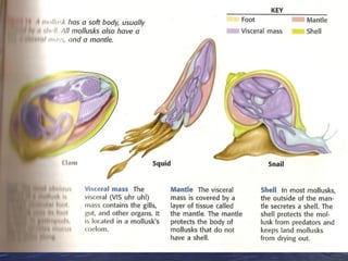 The document discusses the three main classes of mollusks: gastropods which include slugs and snails, bivalves like clams that have two shells, and cephalopods such as squid and octopus. It provides details about their anatomy including that they have a foot, visceral mass containing organs, and mantle that secretes shells for most. It also describes how different types eat, their circulatory systems, and nervous systems. Facts noted are that most live in oceans, range in size from 1mm to 18m, and cephalopods have the most advanced nervous system of invertebrates.