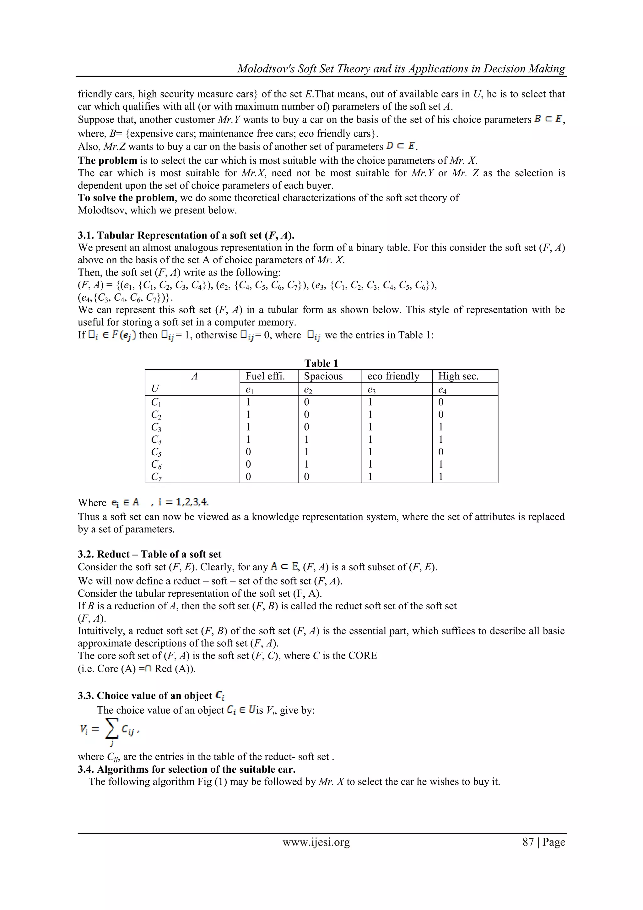 The paper discusses the application of Molodtsov's soft set theory as a mathematical tool for addressing decision-making problems under uncertainty. It presents a practical example involving the selection of a car based on various choice parameters, utilizing soft set theory and its concepts such as reduct-soft-sets and weighted choice values. Ultimately, the study demonstrates how soft set theory can effectively aid in making decisions across different domains, including engineering and marketing.
