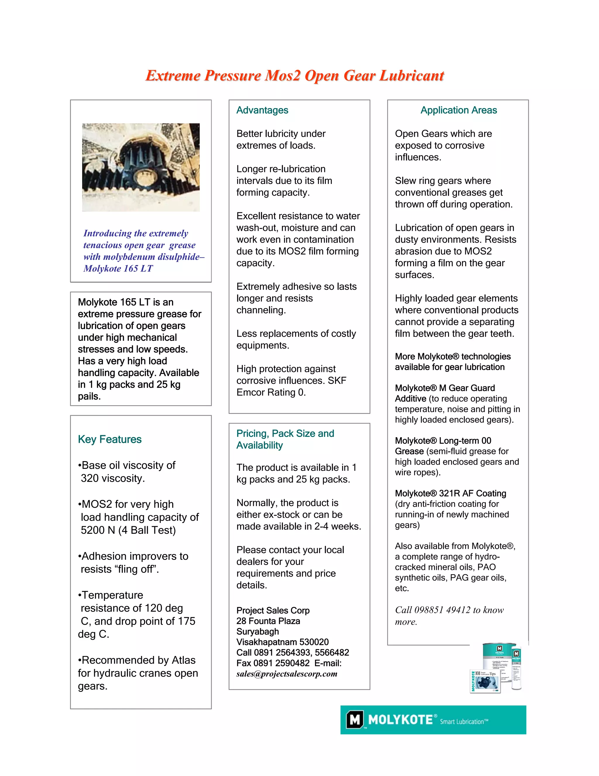 Molykote 165 LT is an extreme pressure grease for lubricating open gears. It forms a protective film using molybdenum disulfide to provide better lubrication under high loads and resist water wash-out. The grease lasts longer through high adhesion and resists flinging off gears. It is recommended for open gears exposed to dust, corrosion, and high loads, and can work in contaminated environments.