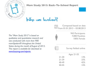 The document summarizes key findings from the "Mom Study 2013" survey of over 900 mothers regarding back-to-school shopping. It found that many moms are looking to purchase new electronics like laptops and tablets, with the most popular brands being HP, Apple, and Dell. Quality was seen as the most important factor when buying products. Most moms begin shopping 1-2 months before school starts rather than waiting until closer to the start of the school year.