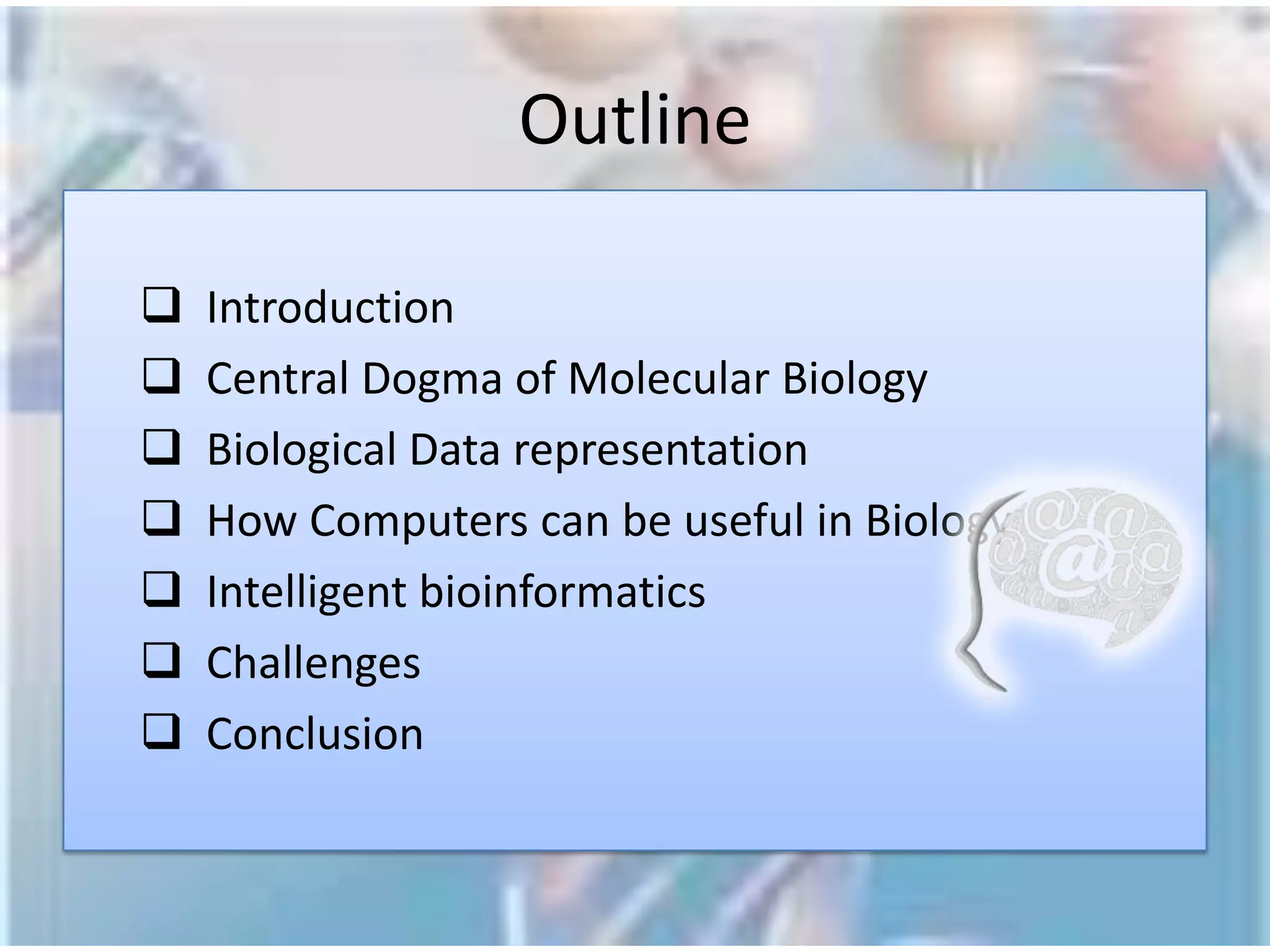 Bioinformatics is an interdisciplinary field that combines biology, computer science, and information technology. It involves the electronic storage, retrieval, analysis, and correlation of biological data. The document outlines key concepts in bioinformatics including the central dogma of molecular biology, biological data representation, how computers can be useful for biology, challenges in the field, and examples of intelligent bioinformatics applications. It emphasizes that bioinformatics is an important and growing field at the intersection of biology and computer science.