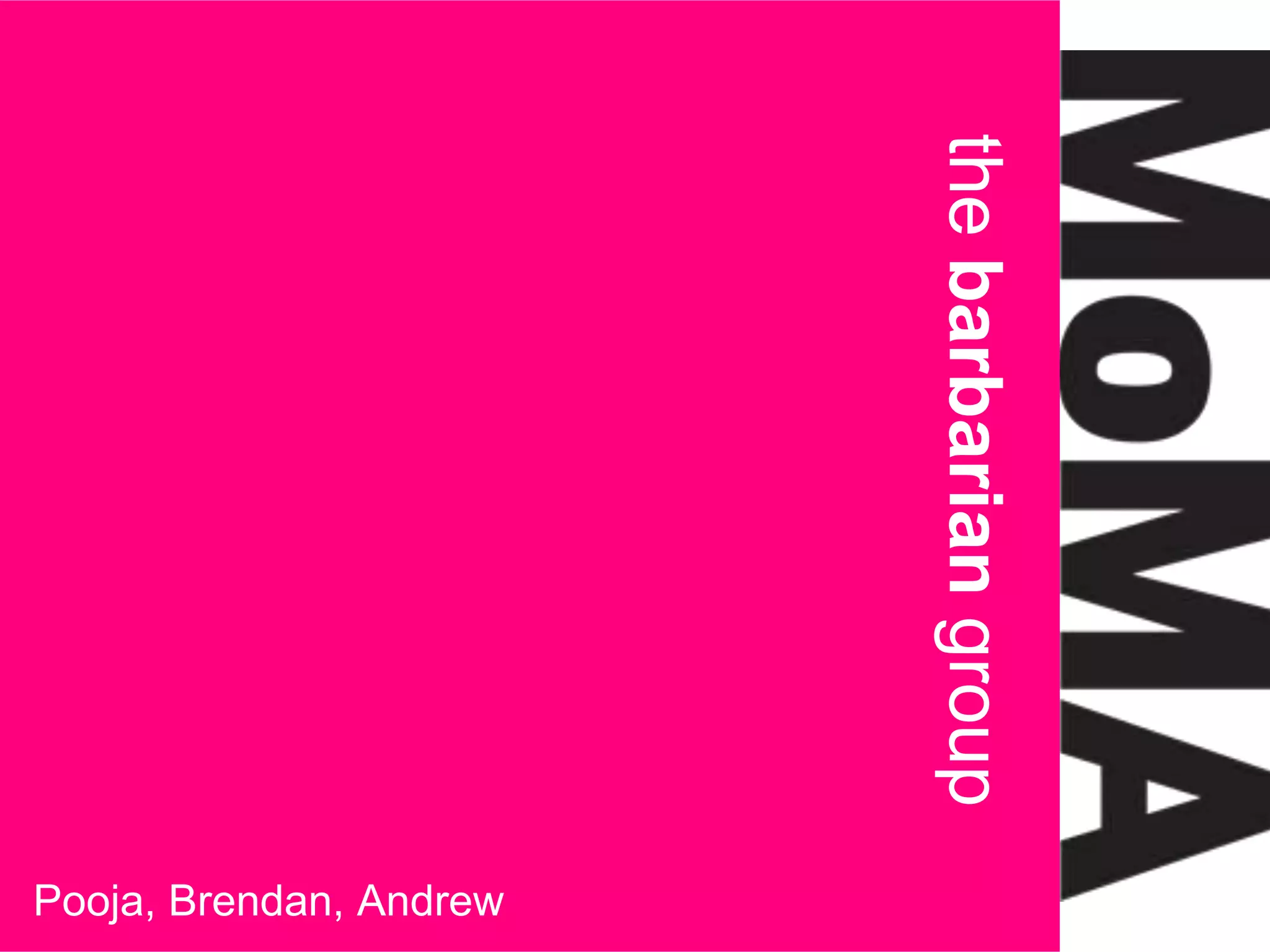 MoMA is one of the largest and most influential modern art museums in the world, founded in 1929. It seeks to create a dialogue between established and experimental art, both past and present. The Barbarian Group believes partnering with MoMA could help the museum engage more with millennials through social media campaigns and partnerships with fashion brands popular among younger audiences. This would help increase museum visits and online conversations to prove MoMA embraces innovation in the digital age.