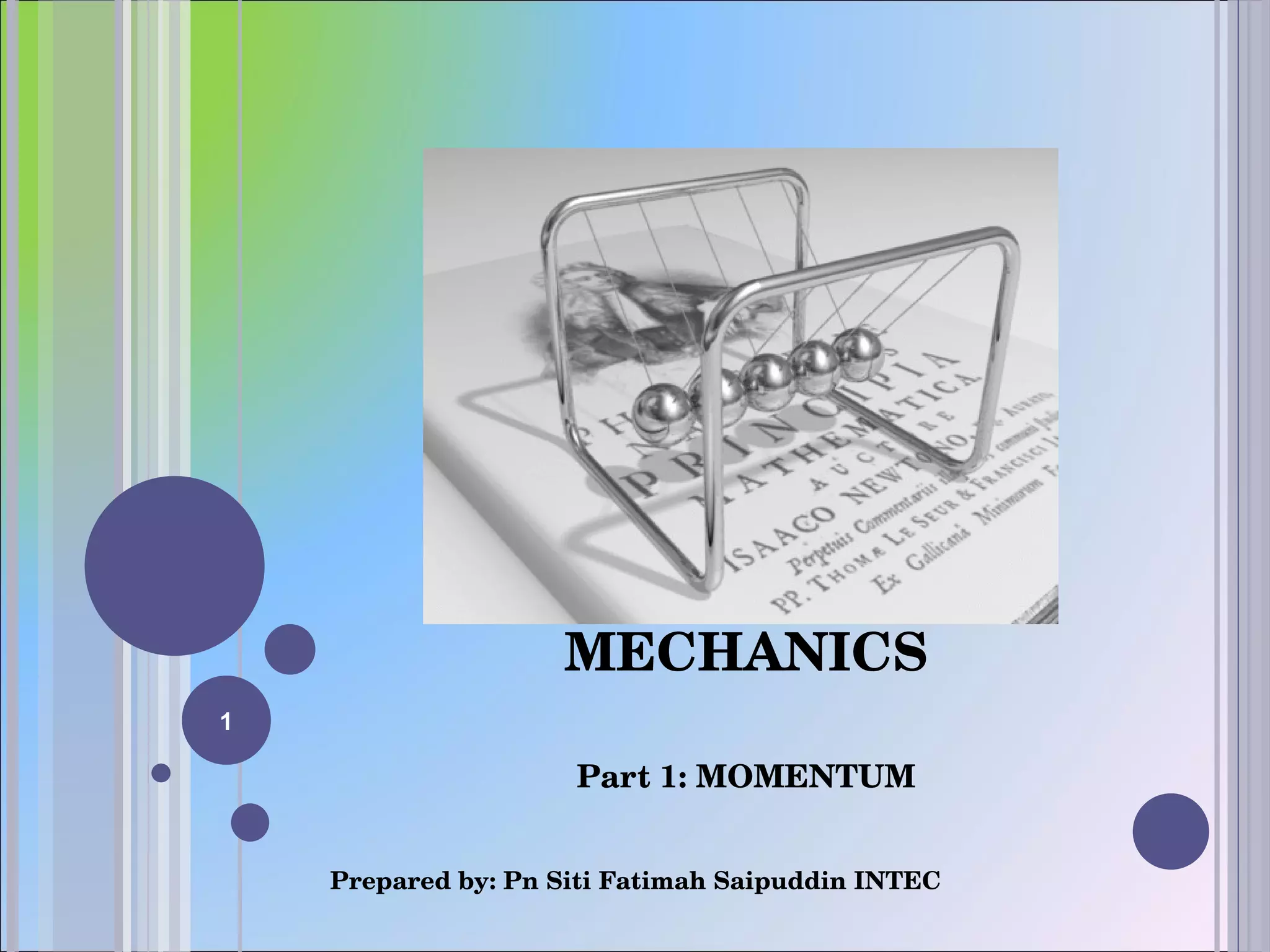 The document discusses momentum, conservation of momentum, collisions, impulse, and friction. It defines momentum as mass times velocity and states that the total momentum before and after a collision remains the same if no external forces act, according to the conservation of momentum principle. It also distinguishes between elastic, inelastic, and completely inelastic collisions, and defines impulse as the change in momentum caused by a force over time. Static and kinetic friction are defined, with kinetic friction less than static friction. Examples and exercises demonstrate applications of these concepts.