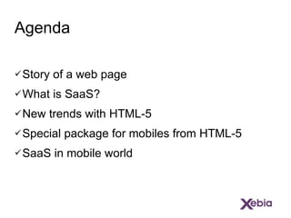 The document discusses the future of Software as a Service (SaaS) in relation to HTML5, emphasizing its significance in mobile applications. It highlights trends, advantages of using HTML5 for mobile web apps, and compares web apps to native apps. The author, Ganesh Gembali, concludes with an invitation for questions and provides contact information.