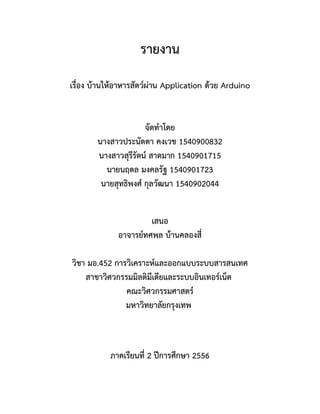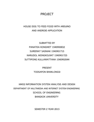 รายงานฉบับนี้จัดทำขึ้นในรายวิชา ม.อ.452 การวิเคราะห์และออกแบบระบบสารสนเทศ (MI452 Information System Analysis and Design) ภาคเรียนที่ 2 ประจำปีการศึกษา 2556 ในโครงการที่มีชื่อว่า บ้านให้อาหารสัตว์ผ่าน Application ด้วย Arduino ซึ่งเนื้อหาภายในรายงาน ประกอบด้วย การนำเสนอกระบวนการออกแบบและพัฒนาซอฟต์แวร์ (System Development Life Cycle) จำนวน 6 กระบวนการ ซึ่งประกอบด้วย Process 1 Identity problem and obtain approval, Process 2 Plan and monitor the project (Plan and Monitor Activities), Process 3 Discover and understand details (Analysis Activities), Process 4 Design system components (Design Activities), Process 5 Build, test, and integrate system (Implementation Activities) และ Process 6 Completes system tests and deploy solution (Deployment Activities) ซึ่งผู้จัดทำหวังเป็นอย่างยิ่งว่า รายงานฉบับนี้จะเป็นประโยชน์กับนักเรียน นักศึกษาและผู้ที่สนใจในการนำหลักการ SDLC มาปรับใช้ในการทำซอฟต์แวร์ หรือการออกแบบและวางแผนการพัฒนาซอฟต์แวร์ในโครงการต่างๆ ที่จะคิดทำขึ้นได้เป็นอย่างดี