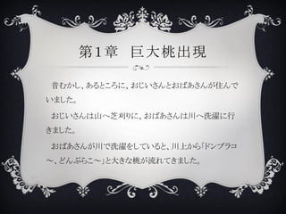 第1章 巨大桃出現 昔むかし、あるところに、おじいさんとおばあさんが住んで いました。 おじいさんは山へ芝刈りに、おばあさんは川へ洗濯に行 きました。 おばあさんが川で洗濯をしていると、川上から「ドンブラコ ~、どんぶらこ~」と大きな桃が流れてきました。