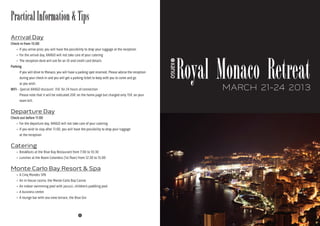 This document provides information for guests attending a retreat at the Royal Monaco Retreat. It includes details about check-in and check-out times, parking, wifi access, and catering options. The schedule outlines activities like a royal regatta sailboat trip, meetings with a speaker, and an intimate dinner. Transportation and dress codes are noted. Contact information is provided for assistance during the retreat.
