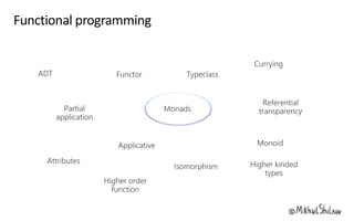 The document discusses the concept of monads in programming, particularly for Object-Oriented Programming developers who are learning functional programming. It includes various code examples and illustrations of how monads can be structured using classes and methods, emphasizing their role in managing sequential computations and workflows. Notable figures such as Douglas Crockford and Tomas Petricek are quoted on the challenges of understanding and explaining monads.