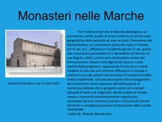 Il documento analizza l'importanza dei monasteri benedettini in Europa, che emersero come rifugi di pace durante un periodo travagliato di guerre e carestie, diventando centri economici e culturali. Viene evidenziata la diffusione del monachesimo nelle Marche, in particolare grazie alla figura di San Benedetto e alla costruzione di abbazie significative che contribuirono alla formazione della società medievale. Ogni monastero descritto è accompagnato da dettagli storici e architettonici, rivelando il loro ruolo cruciale nella storia e nella cultura locale.