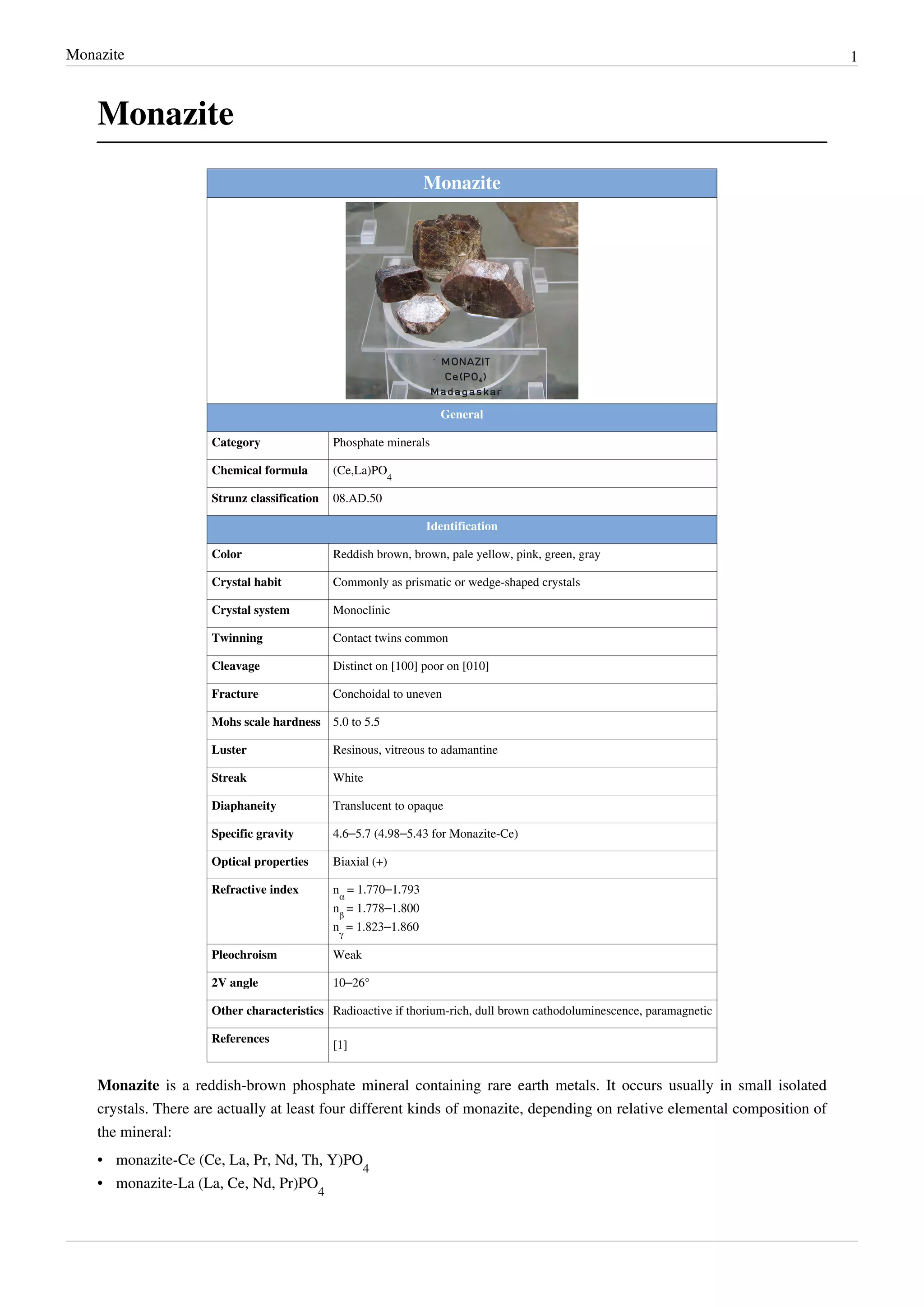 Monazite is a reddish-brown phosphate mineral that is an important ore of rare earth elements such as lanthanum, cerium, and thorium. It commonly occurs as small isolated crystals and has a hardness of 5.0-5.5. Historically, monazite sand from Brazil and India was the primary source of thorium and lanthanides until the 1960s. Monazite deposits can be mined and the monazite extracted using gravity, magnetic, and electrostatic separation due to its high density.