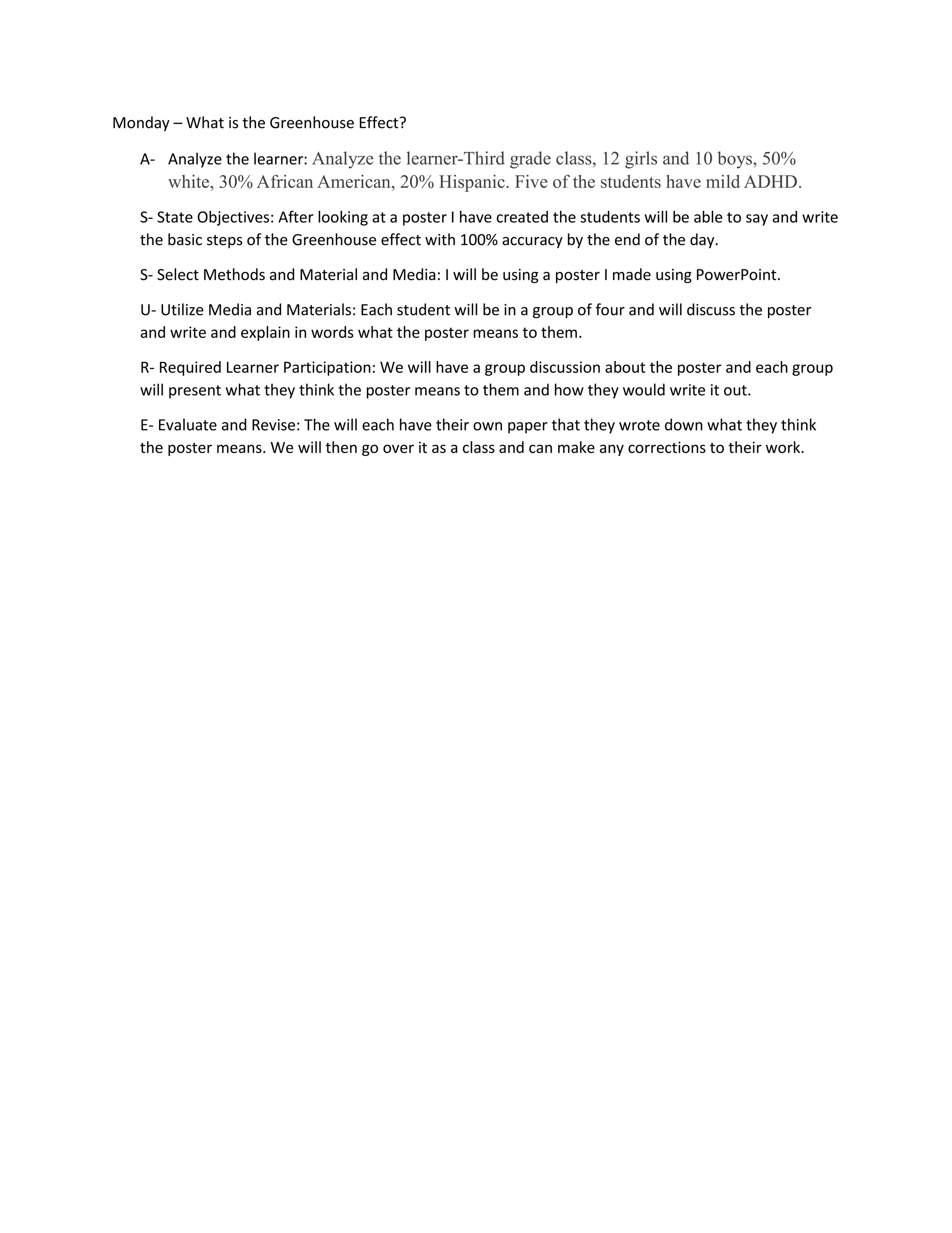 The document outlines a lesson plan for teaching third grade students about the greenhouse effect. It analyzes the class demographics and sets an objective for students to explain the basic steps of the greenhouse effect with 100% accuracy by the end of the day. Small groups will discuss a poster about the greenhouse effect created by the teacher in PowerPoint and write what they understand, then present to the class. Student work will be evaluated and corrected as a group.