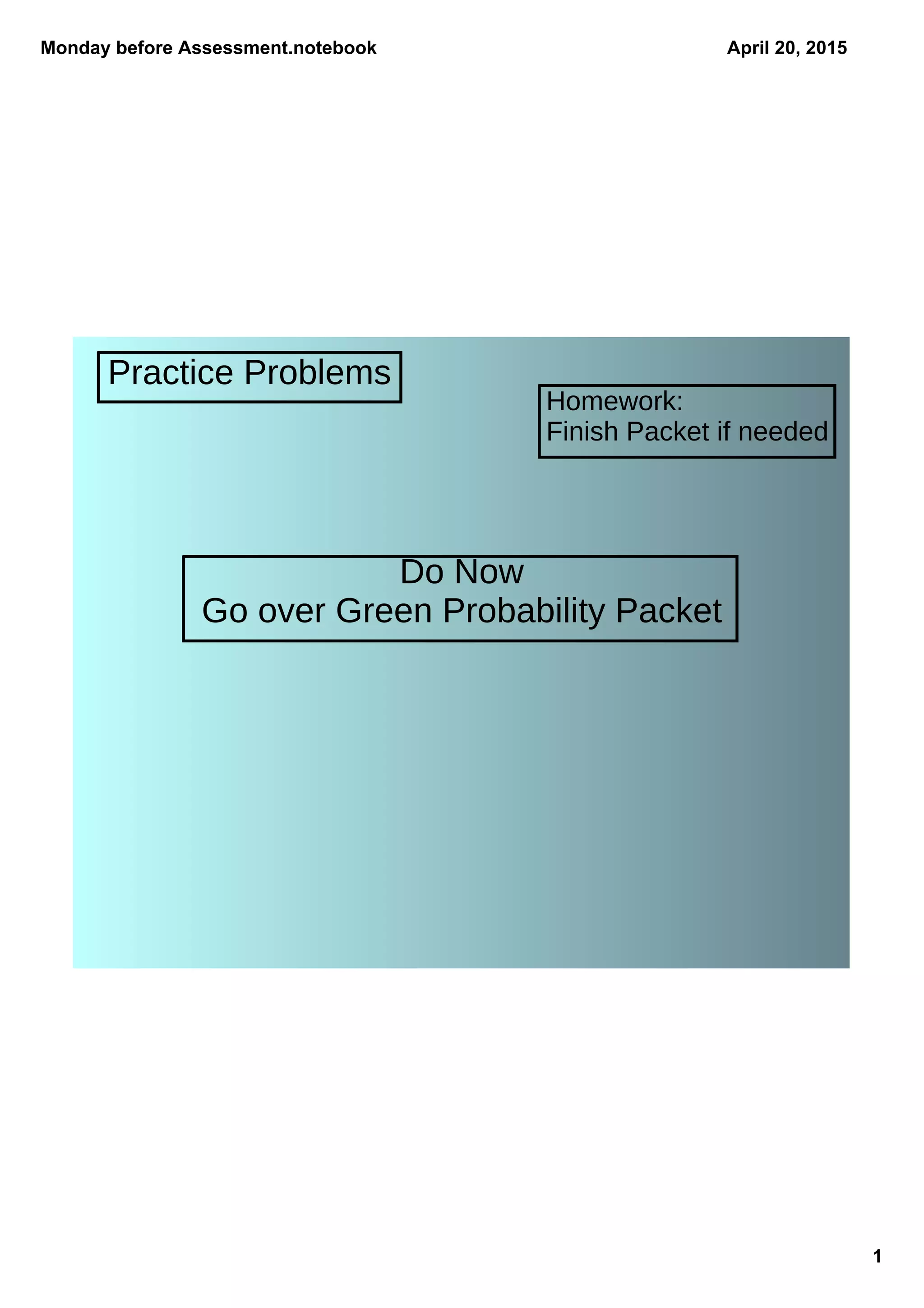 Students were instructed to finish their probability packet homework if needed and to do a "Do Now" activity reviewing probability. The document provided details on the locations and periods for an upcoming math assessment on Wednesday through Friday of that week in rooms 238, 237, 264, and 240 during various periods.