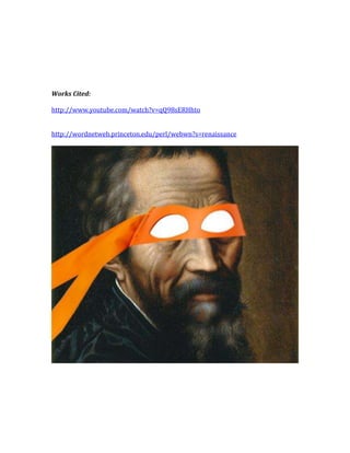This document outlines a lesson plan for a 7th grade class on Michelangelo and the Renaissance. The class has 20 students from a variety of racial backgrounds. The lesson will present information through a lecture, YouTube video, images, and interactive technology. Students will learn about Michelangelo's life and works, as well as the Renaissance period. They will be introduced to tools like Voki and QR codes to engage multiple learning styles and link to additional online resources. The goal is for all students to be able to identify Michelangelo by the end of the class.