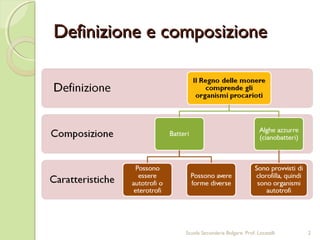 Il documento fornisce una panoramica sui batteri, definendoli come organismi unicellulari con una struttura cellulare composta da elementi come capsula batterica e nucleoide. Viene inoltre discussa la classificazione dei batteri, evidenziando che si conoscono oltre 10.000 specie, ma si stima ce ne siano più di un milione. Infine, il testo menziona alcuni batteri patogeni e le malattie che possono causare, nonché il loro ruolo ecologico e il metodo di riproduzione asessuata.