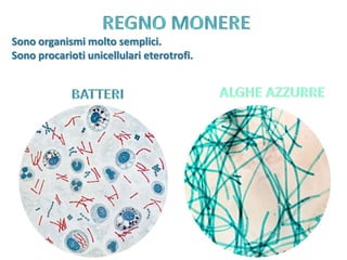 Il documento descrive i batteri come organismi procarioti unicellulari eterotrofi che possono vivere in diversi ambienti e giocano ruoli cruciali, inclusa la produzione di alimenti. I protisti sono eucarioti unicellulari che comprendono alghe e protozoi, anch'essi con funzioni ecologiche significative. Viene fornito un glossario che definisce termini chiave relativi alla classificazione e alla vita degli organismi.