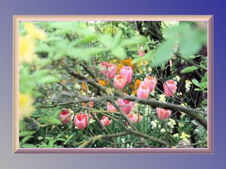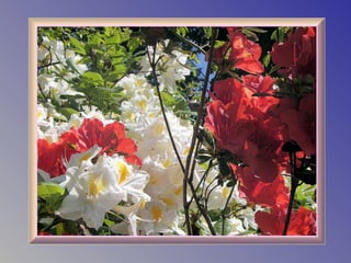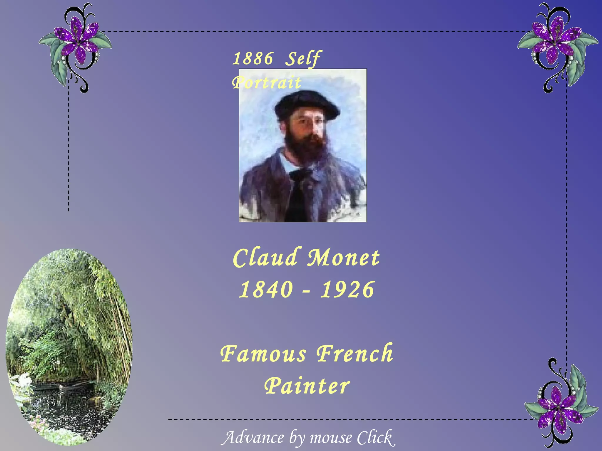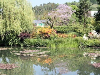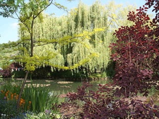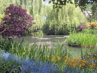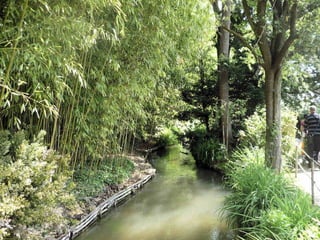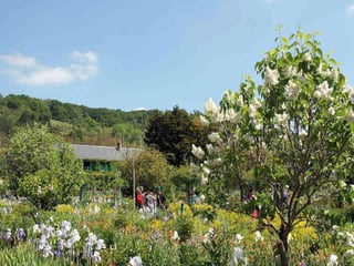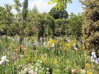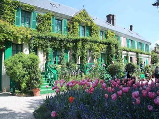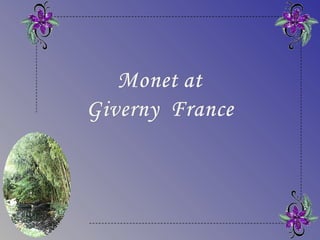 The document provides details about Claude Monet's home and garden in Giverny, France, where he lived from 1883 until his death in 1926 and created many of his famous water lily paintings. It describes the layout of Monet's house, including his studio, bedrooms, kitchen and dining room, and discusses the beautiful flower gardens that surrounded his home which featured water lilies, irises and other vibrantly colored flowers that were the subject of his paintings. The document highlights how Monet's home and gardens have been preserved to reflect how he arranged and maintained them during his lifetime.