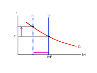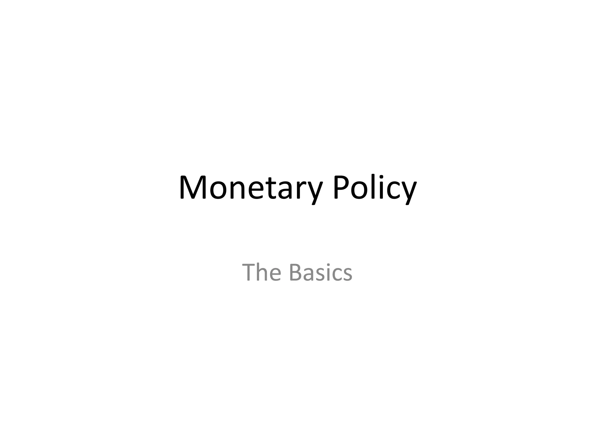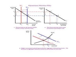 The Federal Reserve uses monetary policy to influence interest rates and the money supply in order to achieve its policy goals of price stability, maximum employment, and moderate long-term growth. It targets the federal funds rate through open market operations and adjusts the money supply through bond purchases and sales. Raising interest rates and reducing the money supply are used to fight inflation, while lowering rates and increasing the supply are used to stimulate the economy during recessions. The Fed aims to keep recessions short and mild through timely countercyclical monetary policy actions.