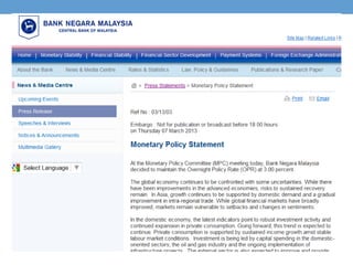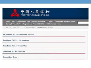 The document discusses how central banks use monetary policy to influence nominal and real interest rates and stabilize the economy. It explains that central banks primarily control the money supply through open market operations, which affect the demand for and supply of money in determining the equilibrium interest rate. Changes in interest rates then impact planned aggregate expenditures and equilibrium output. The document provides examples of how central banks can use monetary policy to address recessionary or inflationary gaps through influencing real interest rates.