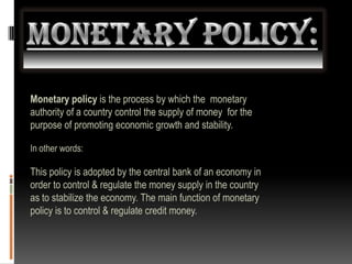 Monetary policy is used by central banks to control the supply of money and regulate credit in order to promote economic growth and stability. There are two types: expansionary policy aims to reduce unemployment by increasing the money supply during recessions, while contractionary policy aims to reduce inflation by decreasing the money supply during expansions. The tools for changing the money supply include open market operations, interest rates, and reserve ratios.