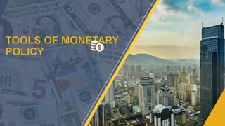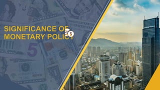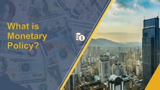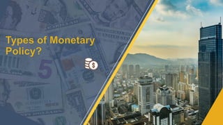 Monetary policy involves actions by a nation's central bank to control money supply and achieve economic goals such as full employment, price stability, and economic growth. Key types of monetary policies include expansionary, contractionary, countercyclical, rule-based, and discretionary policies, each serving different economic objectives. The tools used in monetary policy include open market operations, bank rates, and cash reserve requirements among quantitative and qualitative methods.