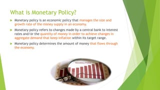 Monetary policy is an economic strategy used by a central bank to control the money supply and interest rates to manage inflation, full employment, and economic growth. Its key objectives include price stability, economic inequality reduction, and exchange stability, achieved through various tools such as interest rate adjustments, open market operations, and credit controls. Ultimately, the policy aims to influence aggregate demand and stabilize the economy by linking monetary conditions to real economic activities.