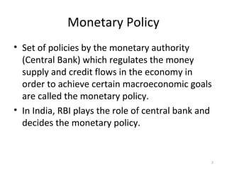 This document discusses monetary policy in India. It defines monetary policy as the set of policies by the Reserve Bank of India to regulate money supply and credit in order to achieve goals like economic growth and price stability. The objectives and instruments of monetary policy are described. Key instruments include repo rate, reverse repo rate, cash reserve ratio, and open market operations, which can expand or contract the money supply. Qualitative measures like credit rationing and moral suasion are also discussed.