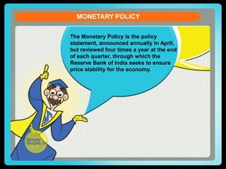 The Monetary Policy is announced annually by the Reserve Bank of India to ensure price stability in the economy. It involves controlling money supply, interest rates, and inflation. The RBI also announces regulations for banks, financial institutions, and other entities it governs. The Monetary Policy differs from the Fiscal Policy in that it aims to impact the economy by adjusting money supply and interest rates, while the Fiscal Policy uses government spending and taxes. The objectives of the Monetary Policy are maintaining price stability and ensuring adequate credit to productive sectors of the economy.