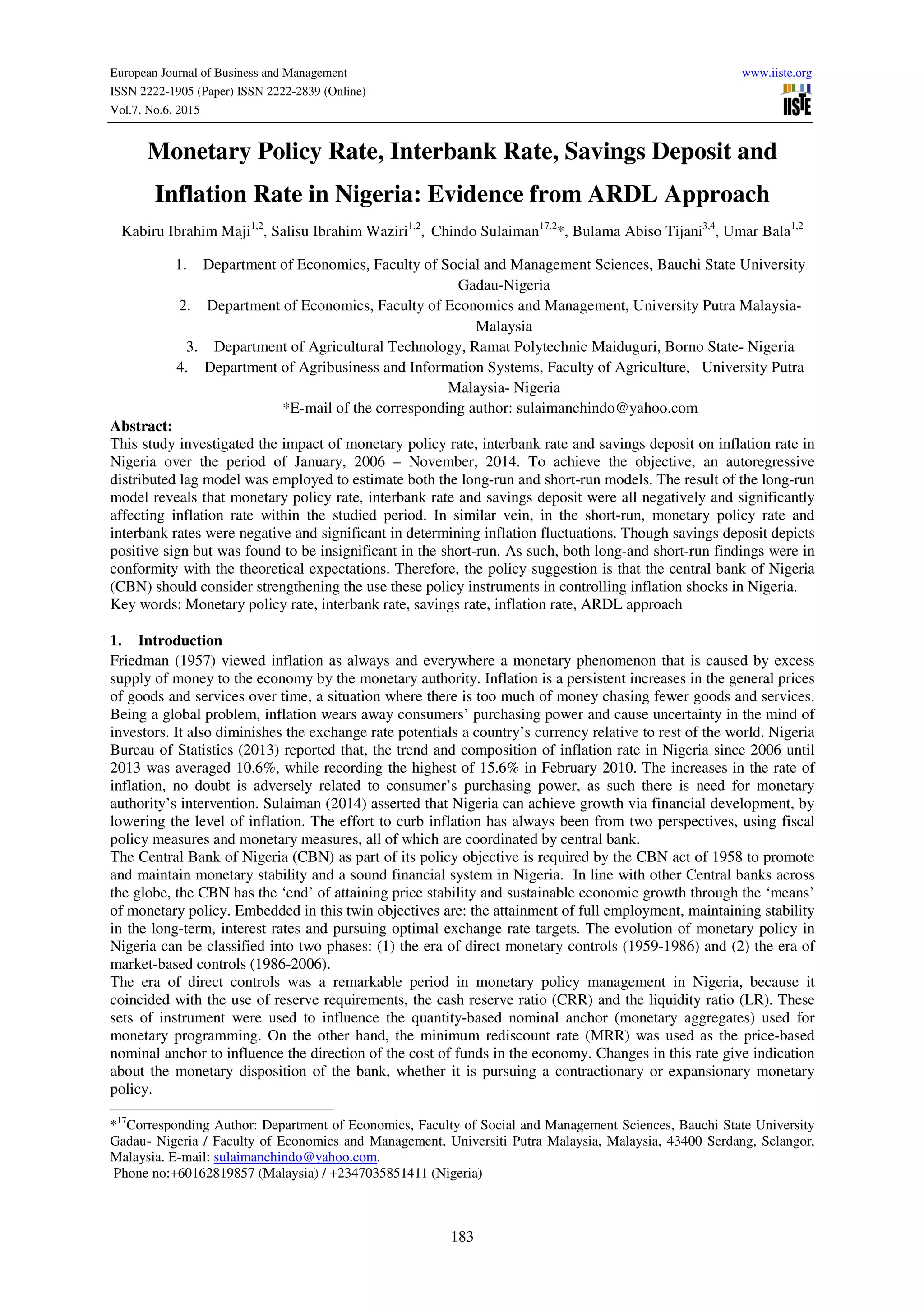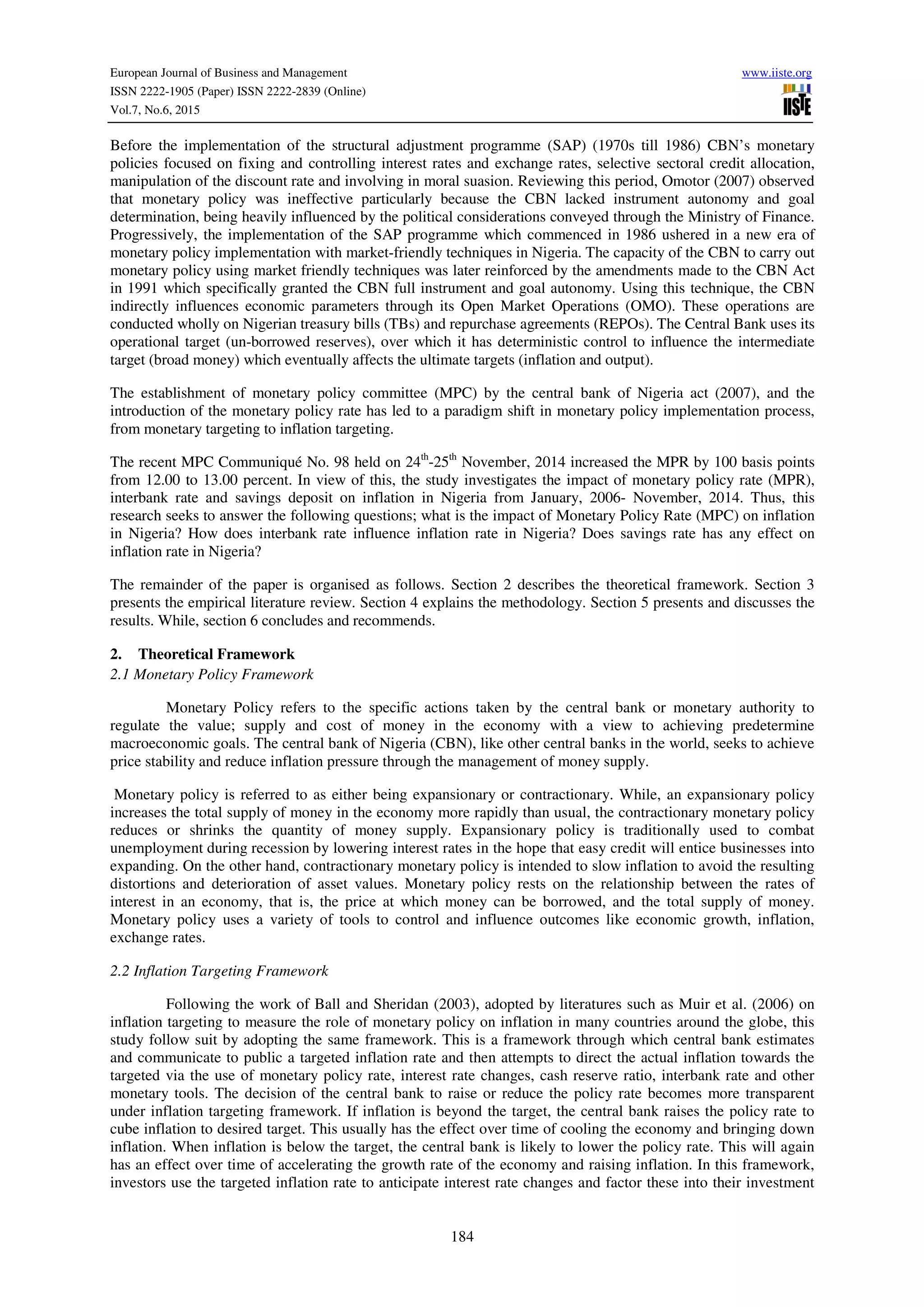 1) The document investigates the impact of monetary policy rate, interbank rate, and savings deposit on inflation rate in Nigeria from 2006-2014 using an autoregressive distributed lag model.