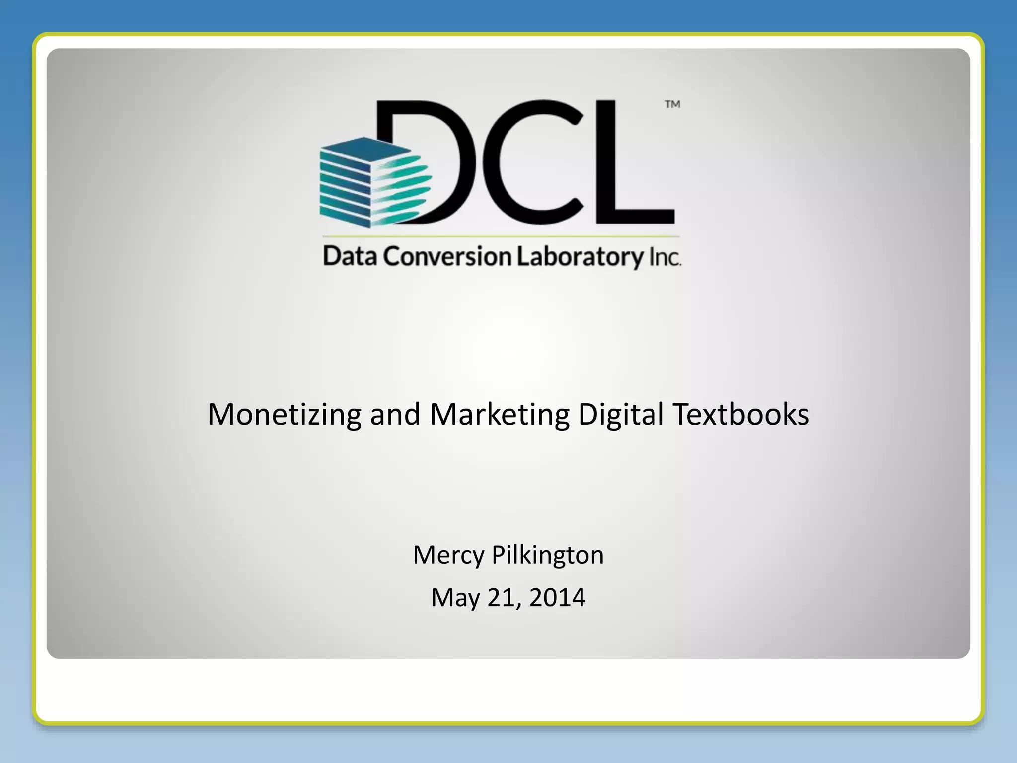 The document discusses the challenges and opportunities in monetizing and marketing digital textbooks, highlighting their distinct features compared to traditional texts. With a projected $8 billion K-12 textbook market, it emphasizes the need for innovation in publishing models and the impact of digital technology on access and content updating. Concerns around cost, content control, and the effectiveness of current adoption cycles are addressed, suggesting a shift towards more flexible purchasing options for educational materials.