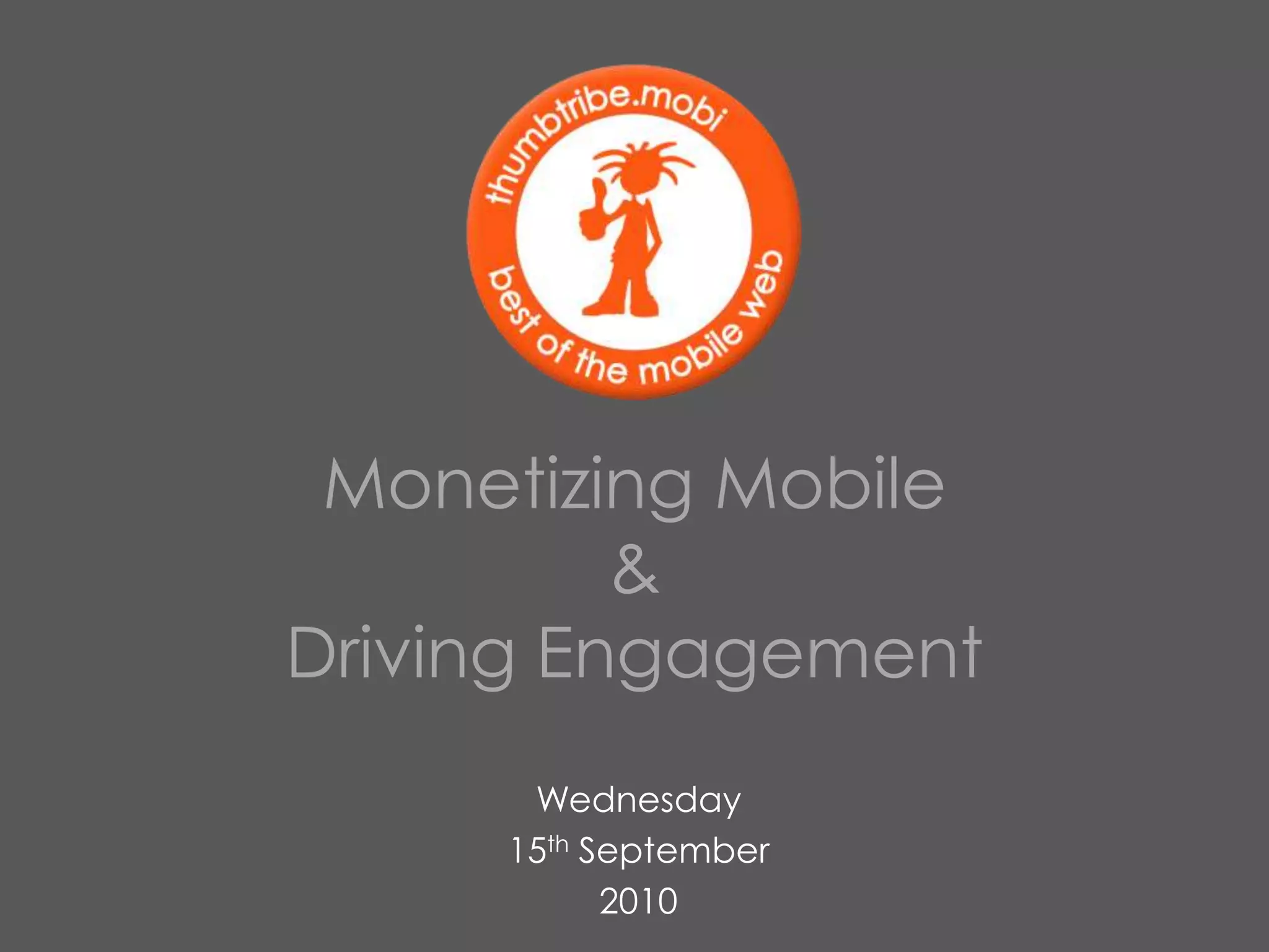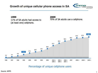 This document discusses how mobile marketing can drive engagement and monetization. It outlines 7 key trends in the mobile market, including the rise of smartphones and tablets. It then provides 5 steps for effective mobile campaigns: 1) use mobile to raise awareness, 2) mobile advertising can be effective across demographics when matched to the right audience, 3) prioritize user experience, 4) focus on mobile display advertising, and 5) offer something of value to users. Overall, the document advocates that mobile provides opportunities to grow businesses by reaching new audiences, changing interactions, and extending markets.