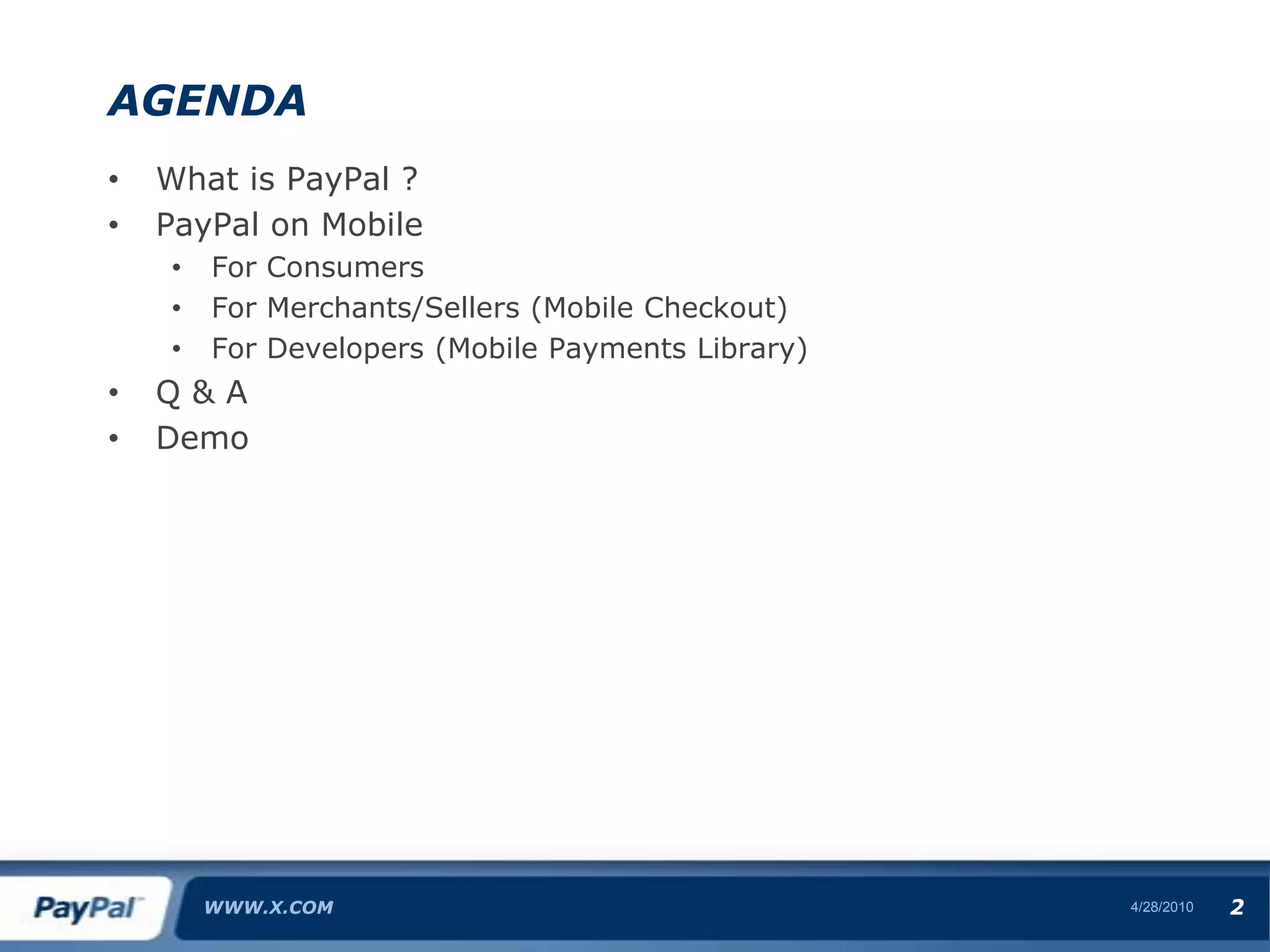 1) PayPal allows consumers to pay and transfer money through mobile apps, mobile web, and SMS on any device. It also offers mobile checkout for merchants.