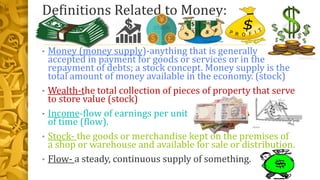 1) Money refers to anything that is generally accepted as payment for goods and services or debt repayment. The document defines related terms like wealth, income, stock, and flow.