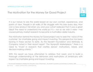 This document provides an introduction and context for the Money for Good project report. The project aimed to understand US consumer preferences and demand for impact investments and charitable donations. A survey of 4,000 individuals was conducted, with half having household incomes over $300k. The survey explored how nonprofits can obtain more donations, how donations can go to top-performing nonprofits, and the potential for impact investing. Key terms are defined, and the project team is described. The report will summarize findings and recommendations based on research into donor and investor behaviors and preferences.