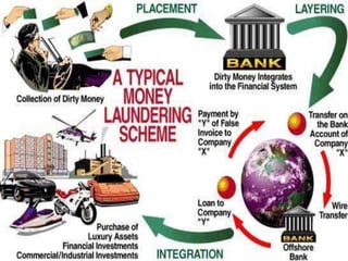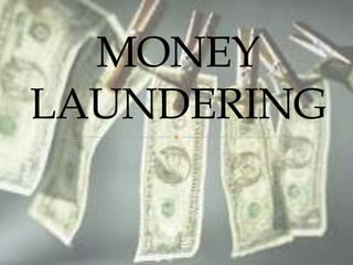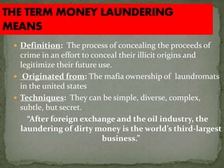 Money laundering is defined as the process of disguising illegally obtained money to make it appear legitimate. It originated from mafia ownership of laundromats in the US and can involve complex techniques to conceal the illicit origins of funds. Money laundering is estimated to cost between $500 billion to $1.5 trillion annually worldwide and poses significant social and economic threats. Countries like India have established agencies and laws to help prevent money laundering and terrorist financing.