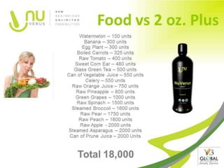 Nuverus International is a 100% debt-free company that offers a clinically backed health product, Nuverus Plus, which contains over 20 superfoods and boasts the highest ORAC value in the industry. The company has a lucrative compensation plan and operates in 16 countries, designed to promote health and longevity through antioxidants. Nuverus offers a unique flexible commission system, allowing associates to choose between unilevel or dual team commissions, with significant earning potential and rewards.