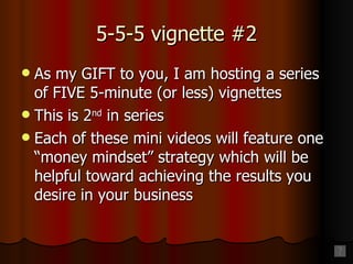 The document introduces a series of five 5-minute vignettes focused on 'money mindset' strategies aimed at empowering individuals to achieve greater financial success in their business. The second vignette encourages participants to assess and reset their 'money speedometer' by calculating their highest monthly income average and setting new financial goals. The author provides a step-by-step exercise to help individuals re-evaluate their financial targets quarterly to facilitate growth and abundance.