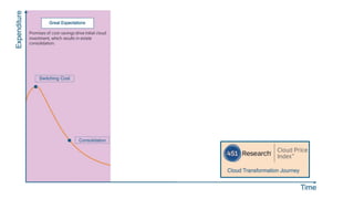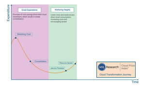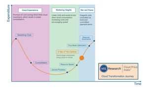 The document discusses cloud transformation trends, highlighting both the challenges and strategies related to cloud adoption among organizations. Key drivers for cloud adoption include cost savings, but organizations frequently face budget overruns due to uncontrolled usage and a complex multi-cloud environment. To optimize cloud costs and improve governance, organizations must implement ongoing optimization practices and address skill shortages within their teams.