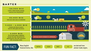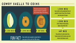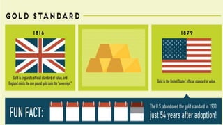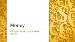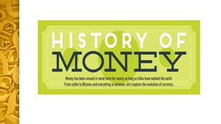 Money has a long history, evolving from bartering to commodity money to coins to paper currency. The US dollar printing process involves engraving master dies, making printing plates, and using intaglio printing on specialized paper with security features. Bills go through quality control before destruction of unusable notes. Modern money is fiat currency not backed by precious metals, though it was representative money tied to gold or silver values in the past. Understanding the history and production process provides context around modern monetary systems.