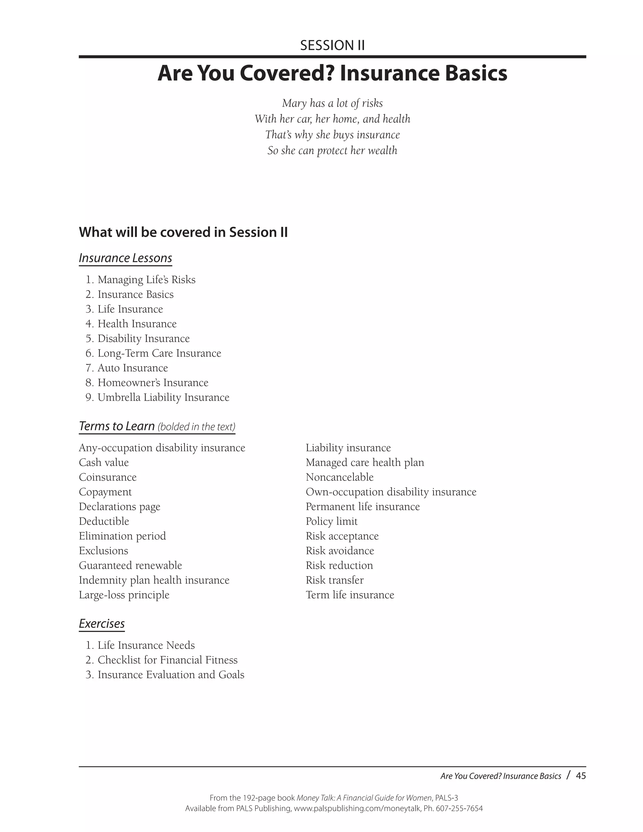 Mary buys various types of insurance to protect herself from financial risks. Session II will cover different types of insurance including life, health, disability, auto, home, and liability insurance. It will define important insurance terms and concepts. Managing risks involves avoiding, reducing, accepting, or transferring them. While insurance protects against large losses, some commonly sold policies like credit life insurance may not be necessary. It's important to follow the "large loss principle" of prioritizing coverage for major risks over minor ones.