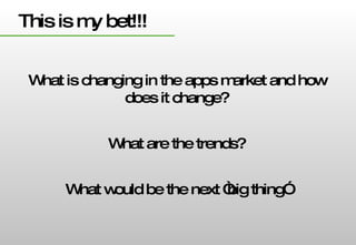 Gian Luca Cioletti is head of business development for Nokia in EMEA. He has over 16 years of experience in international business and holds degrees in electronic engineering and international business management. In the document, he discusses the evolution of the mobile apps market from serving business users to the mass consumer market. Key points include the first commercial mobile phone costing over $4,500 and SMS becoming a popular "killer app" starting in the early 1990s. By 2008, the SMS market was estimated at $130 billion. Cioletti also notes convergence across platforms like PC/mobile and services/apps, and asks what future trends and the "next big thing" may be in this changing market.