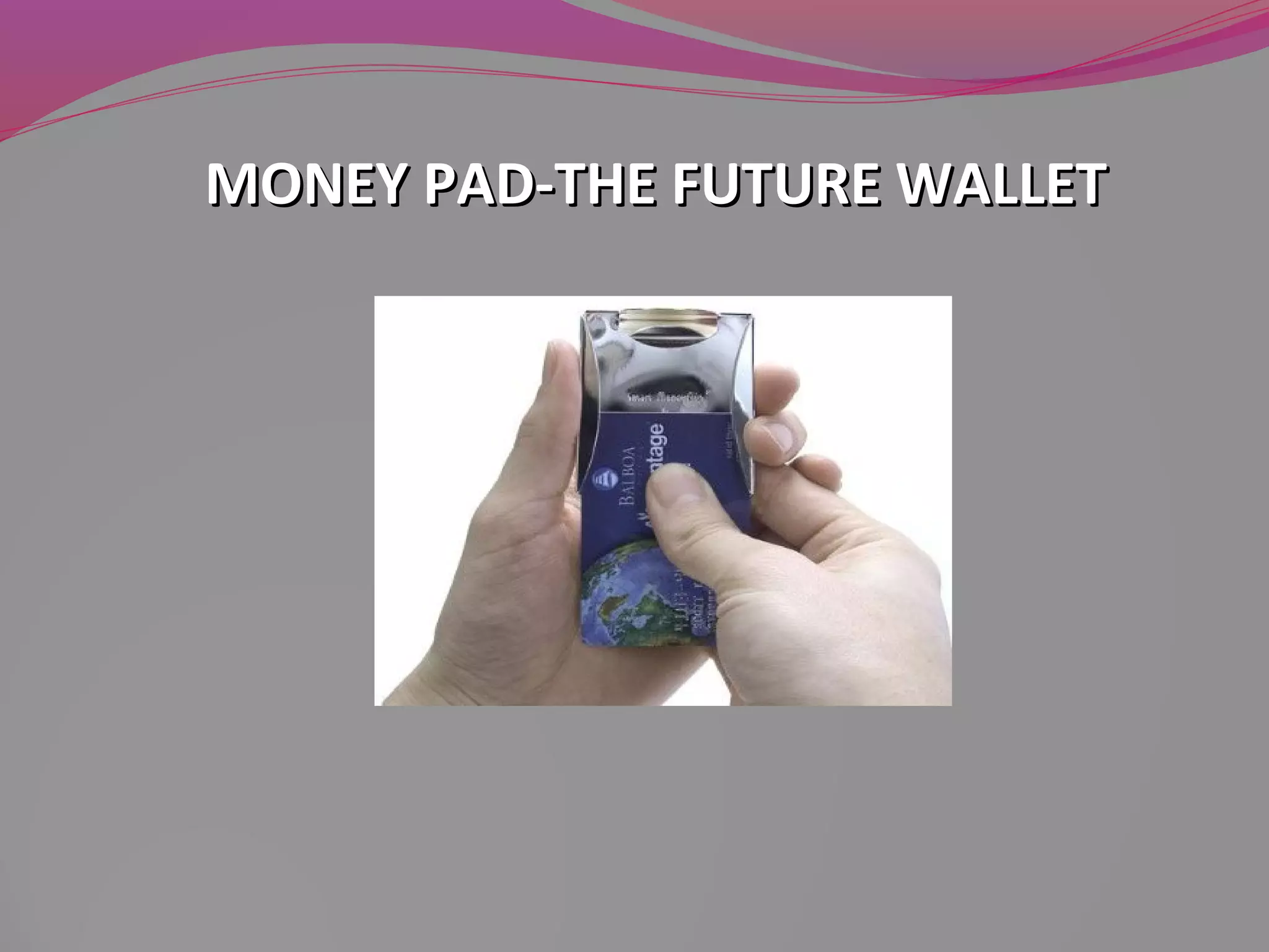 The document describes Money Pad, which is proposed as a replacement for paper currency and cards for electronic transactions. Money Pad uses fingerprint recognition for security. It would store digital cash and transaction information. To use it, a user would register at a bank, providing fingerprints. The Money Pad would then store the user's account information and fingerprint for verification during transactions. It aims to provide instant funds transfers, avoid insecure cash carrying, and ensure strong security for electronic payments.