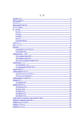 该文档介绍了 NoSQL 数据库,特别是 MongoDB 和 Redis 的基本特性及其工作原理。MongoDB 是一种面向集合的文档数据库,具有模式自由和高性能的特点,而 Redis 则是一种内存中的键值数据库,支持多种数据类型和持久化机制。文档详细列出了它们的功能、资源消耗、操作方式及使用场景,强调了与传统关系型数据库的主要区别。