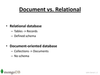 Document-oriented databases store data in collections of documents rather than tables with a predefined schema. MongoDB is an open-source, document-oriented database that is easy to install and use. It supports many programming languages and operating systems. Documents in MongoDB can have unique field sets and storing non-normalized data can provide faster speeds than relational databases for heavy use cases.