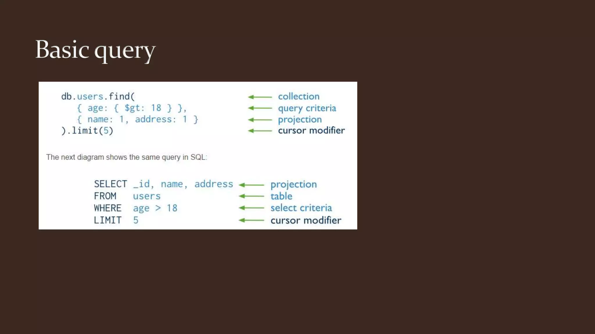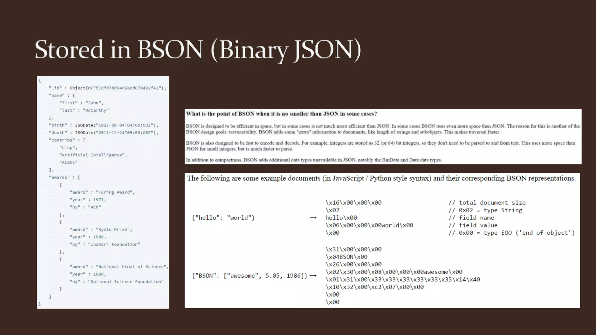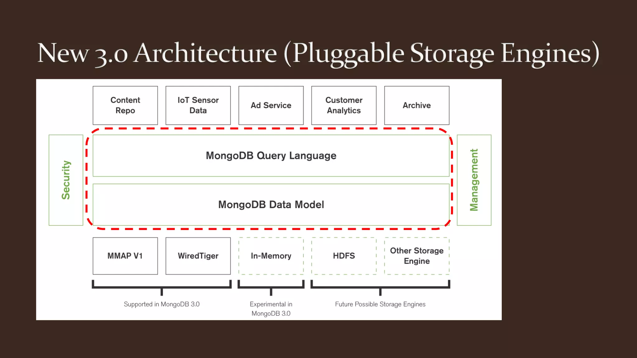 This document summarizes key aspects of MongoDB including its data model, query language, and data management features. It discusses how MongoDB uses storage engines to manage data storage and supports different engines for different workloads. It also covers MongoDB's dynamic and flexible schema, data modeling approaches using embedded documents, and core tools for importing, exporting, and diagnosing MongoDB deployments.